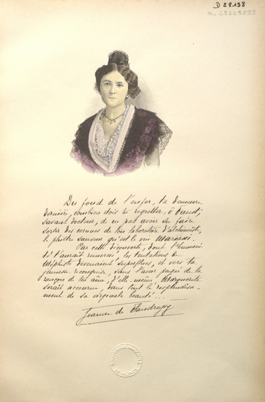 Ci-contre : Portrait de Jeanne de Flandreysy habillée à la mode provençale. Jeanne de Flandreysy, portrait extrait du 9e volume de l'Album Mariani, Figures contemporaines (BMV, D28198), avec la dédidace de Jeanne de Flandreysy pour le catalogue Mariani.