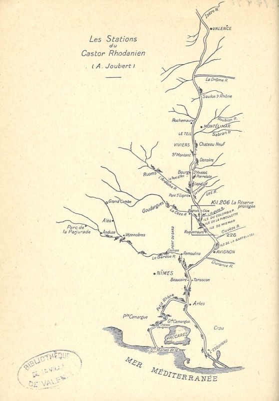 Ci-contre : carte des « stations » du castor dans le bassin du Rhône. Paul Cordier-Goni, Castors du Rhône, Albin Michel, 1947