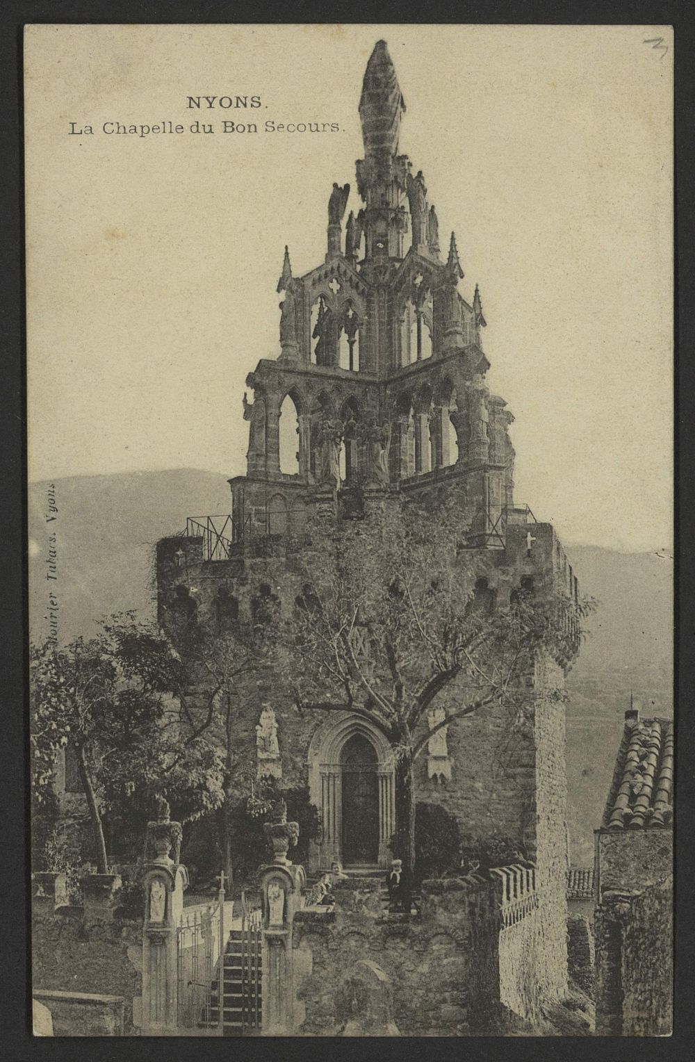 TitreNyons - La chapelle du Bon-SecoursEditeurEdition L. Mourrier, tabacs (Nyons)Date1903DescriptionCA 1903Type de documentIconographie Cartes postalesFormat14x19 cm ; Noir et blancCoteB263626101_CP808UtilisationDomaine publicSourceMédiathèques de Valence Romans AggloParticipez pour enrichir ces informationsContactez-nous