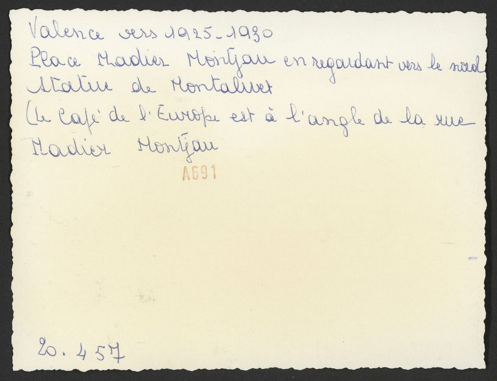TitrePlace Madier Montjau en regardant vers le nord. Statue de Montalivet. Le café de l'Europe est à l'angle de la rueDate1925DescriptionCA 1925-1930Type de document PhotographiesFormat14,2x10,4 cm ; Noir et blancCoteB263626101_43Y1UtilisationDomaine publicSourceMédiathèques de Valence Romans AggloParticipez pour enrichir ces informationsContactez-nous