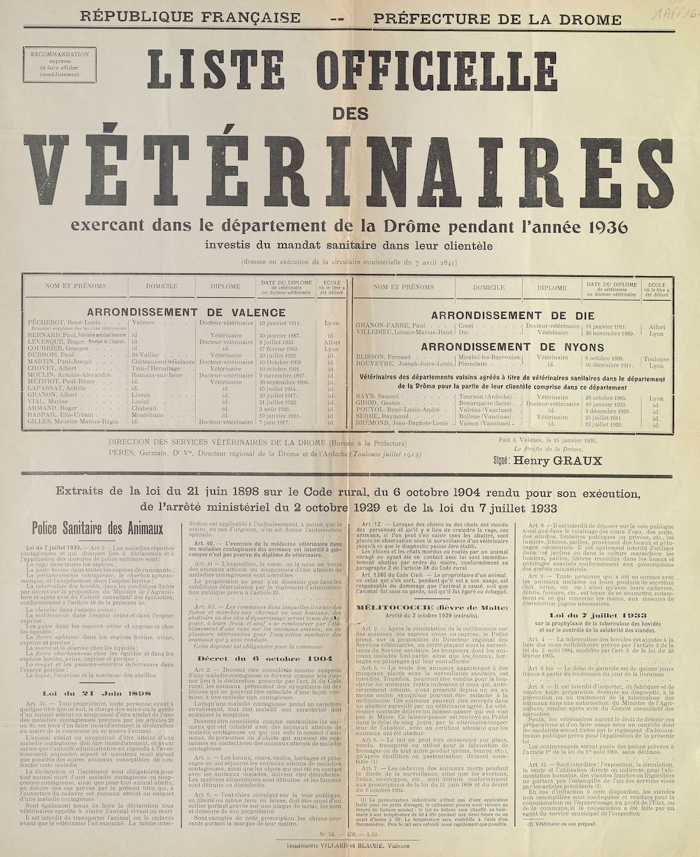 Préfecture de la Drôme : Liste officielle des vétérinaires exerçant dans le département de la Drôme pendant l'année 1936 [Valence, le 15 janvier 1936]
