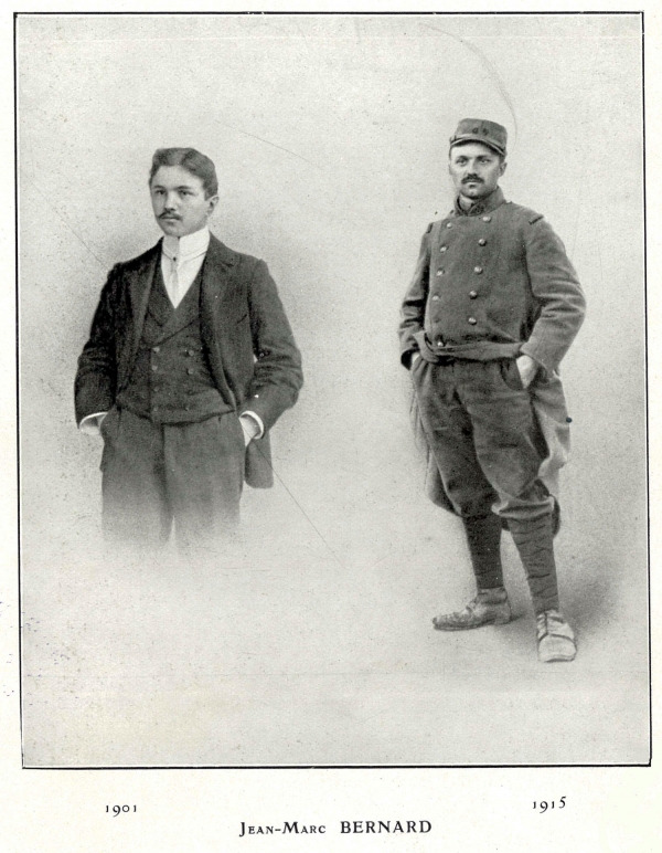 Bien que reconnu inapte au service militaire en raison de sa petite taille et sa santé "délicate", J-M Bernard se présente au recrutement en Août 1914. D'abord refusé, il sera finalement rappelé en Novembre. En 1915, il est agent de liaison mais est blessé à la tête. Heureusement la blessure n'est pas trop grave et il repart bientôt pour le front où il est chargé du ravitaillement. Puis en Juillet, il est dans les tranchées et le 9 du mois un obus lui ôte la vie. La déflagration est telle que son corps ne sera pas retrouvé.