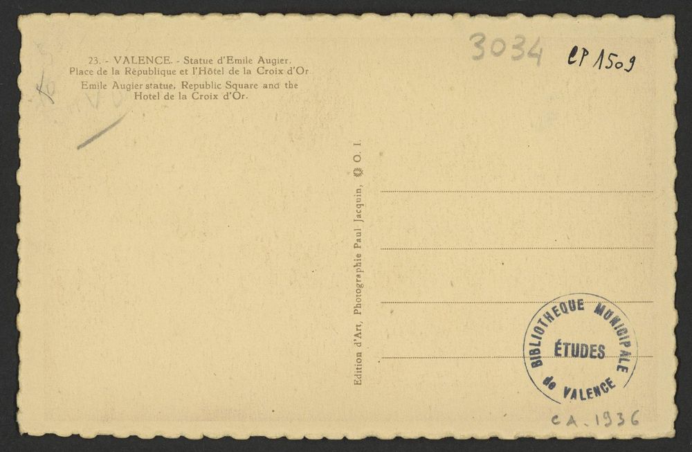 TitreValence - Statue d'Émile Augier - Place de la République et l'Hôtel de la Croix d'OrAuteurJacquin, PaulEditeurEdition d'ArtDate1936DescriptionCA 1936Type de documentIconographie Cartes postalesFormat14x9 cm ; Noir et blancCoteB263626101_CP1509UtilisationDomaine publicSourceMédiathèques de Valence Romans AggloParticipez pour enrichir ces informationsContactez-nous